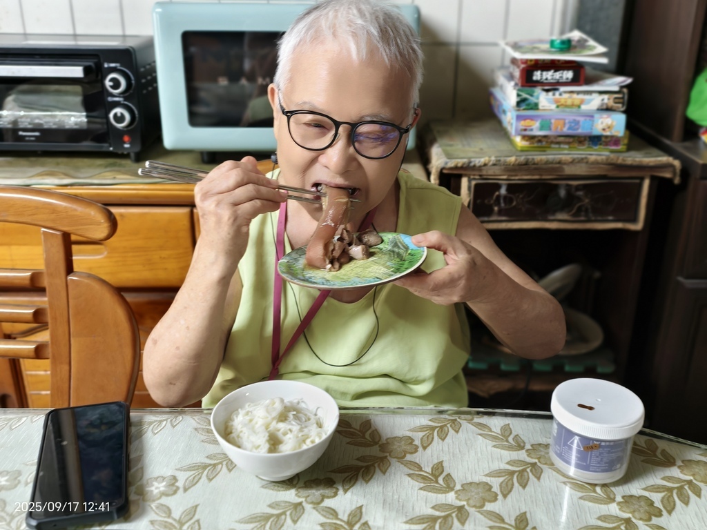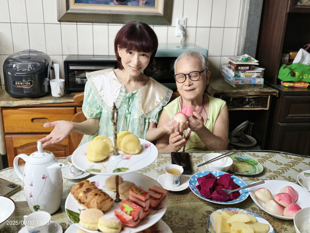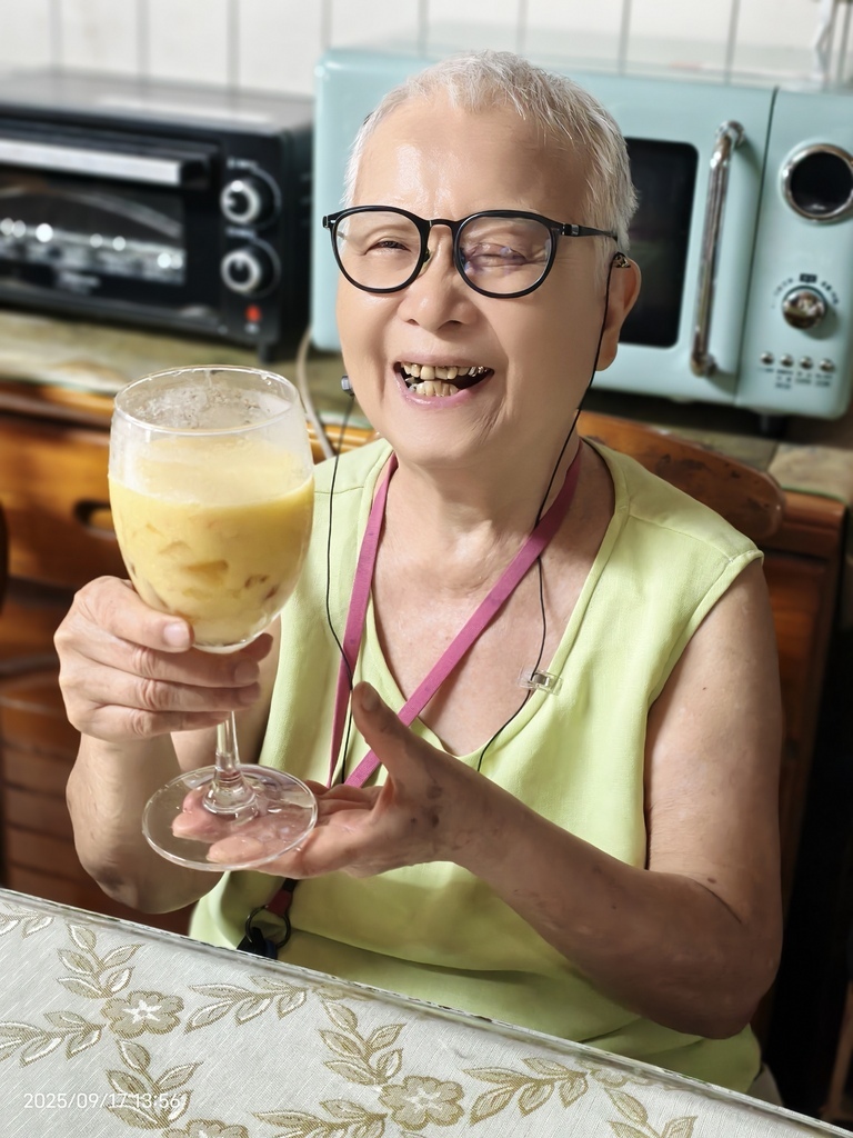 可愛的長孫,拿了個紅酒高腳杯,幫我斟滿果汁,增添外買飲料質感